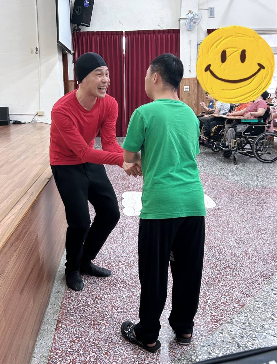 這是第三站,4/16(四)下午在喜樂保育院演出時發生的情景,一位單純的觀眾,非常專注且投入劇情,對下台互動的演員說完話後,並拉著演員的手走回台上,演員也同時在角色裡與他即興回應。最後這位觀眾還直接在台上為著小木偶祝福禱告後才下場。戲才接著演到結尾。這不在劇本裡的一幕,卻給我們留下極深的印象。
